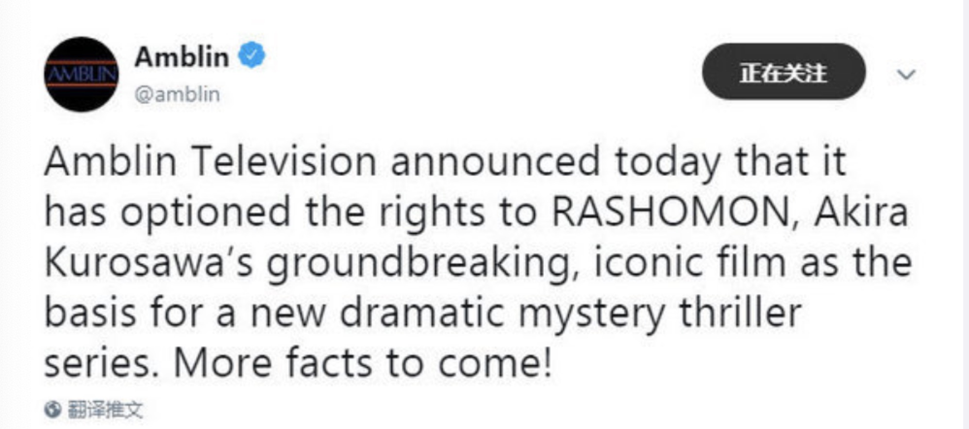 12月19日,为纪念日本导演黑泽明逝世20周年,由史蒂芬·斯皮尔伯格等创立的安培林影业宣布购得黑泽明经典之作《罗生门》的剧集改编权,将其改编为一部10集的剧情悬疑惊悚美剧。消息公布当日,也是斯皮尔伯格的72岁生日。