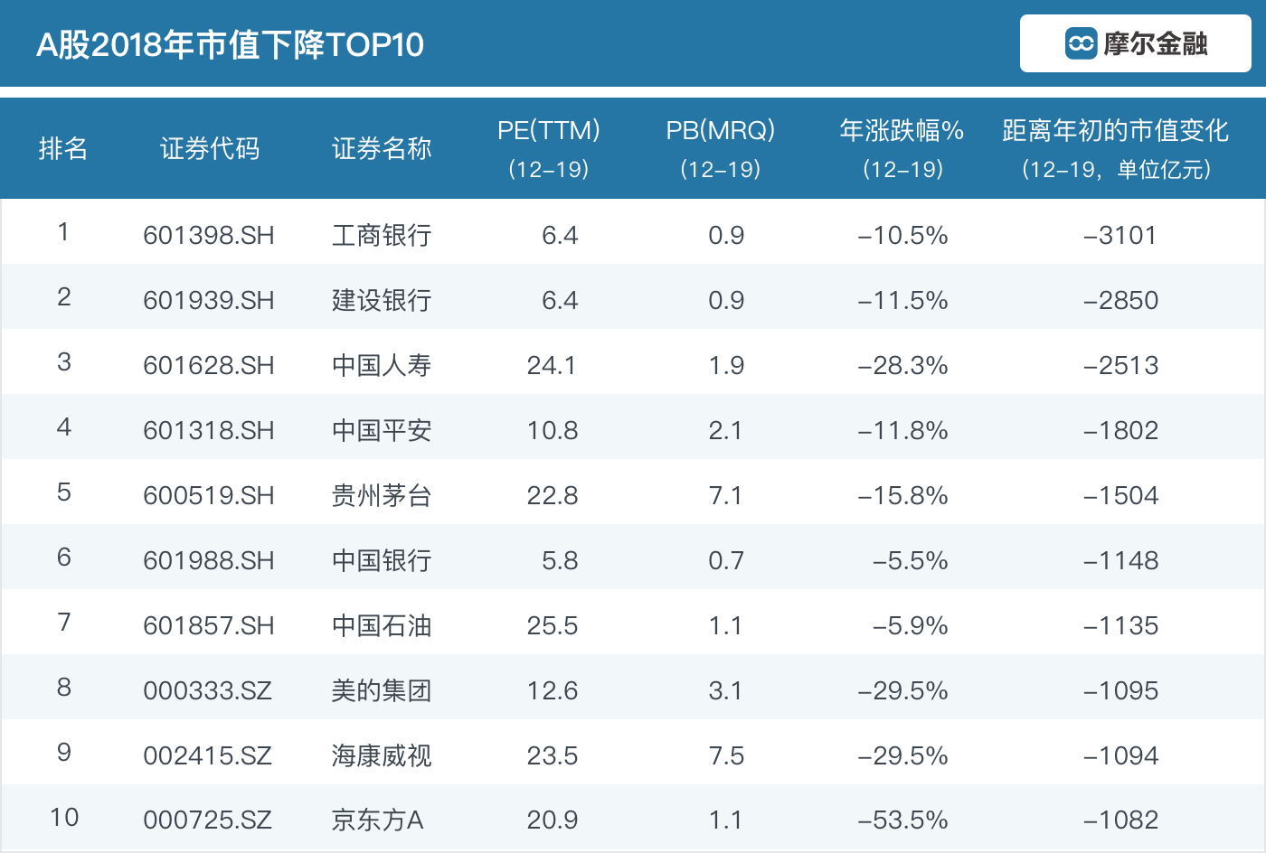 市值下降较多的公司以大型银行和保险公司为主,其实以工商银行为首的大型金融股的跌幅只有上证指数的一半,但是由于体量太大(市值超过万亿),因此导致跌幅不大市值依然下降较多。第五名贵州茅台,创下了近五年的唯一年线收阴。第八名美的集团代表了今年的白色家电行业的惨淡。第九名海康威视收下了上市以来的第一个年k线阴线。最后一名京东方A则是下跌幅度最大-腰斩的白马股,体现了面板行业的强周期性和残酷竞争。