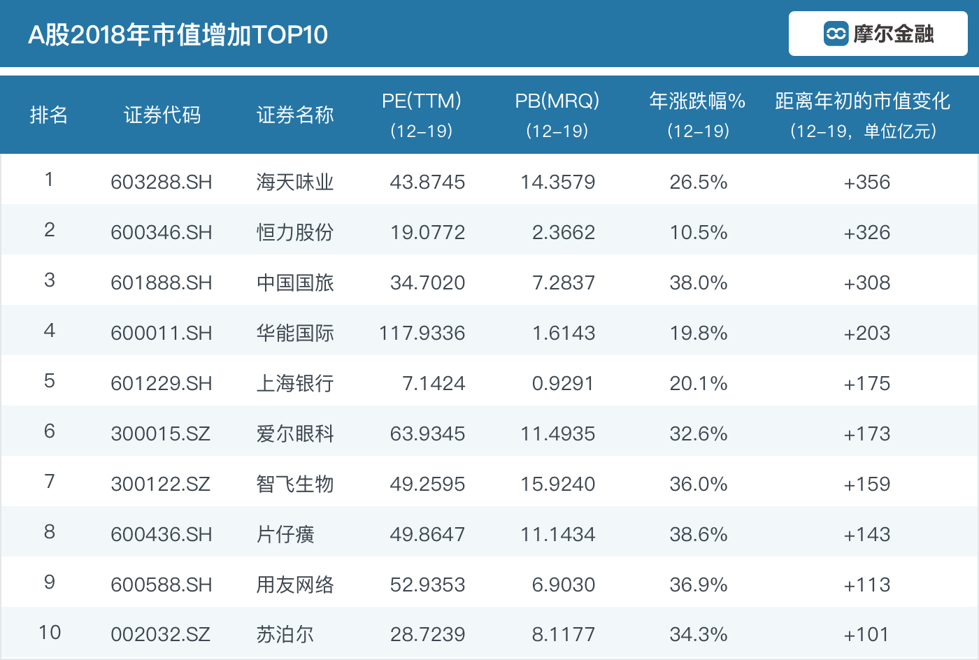 我们来看看经过了一整年的指数下跌,还有哪些公司的市值还可以做到正增长。