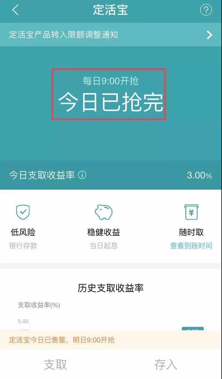 网商银行的相关产品也改为限额销售,近期提示“定活宝产品已进行每日销售限额管理,每日可销售额度将在上午9:00投放,售完即止。”