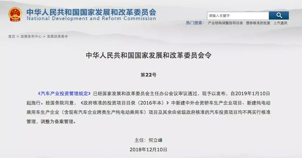 在改革开放40周年纪念日,国家发展改革委在今天发布第22号令,颁布《汽车产业投资管理规定》,自2019年1月10日起施行。