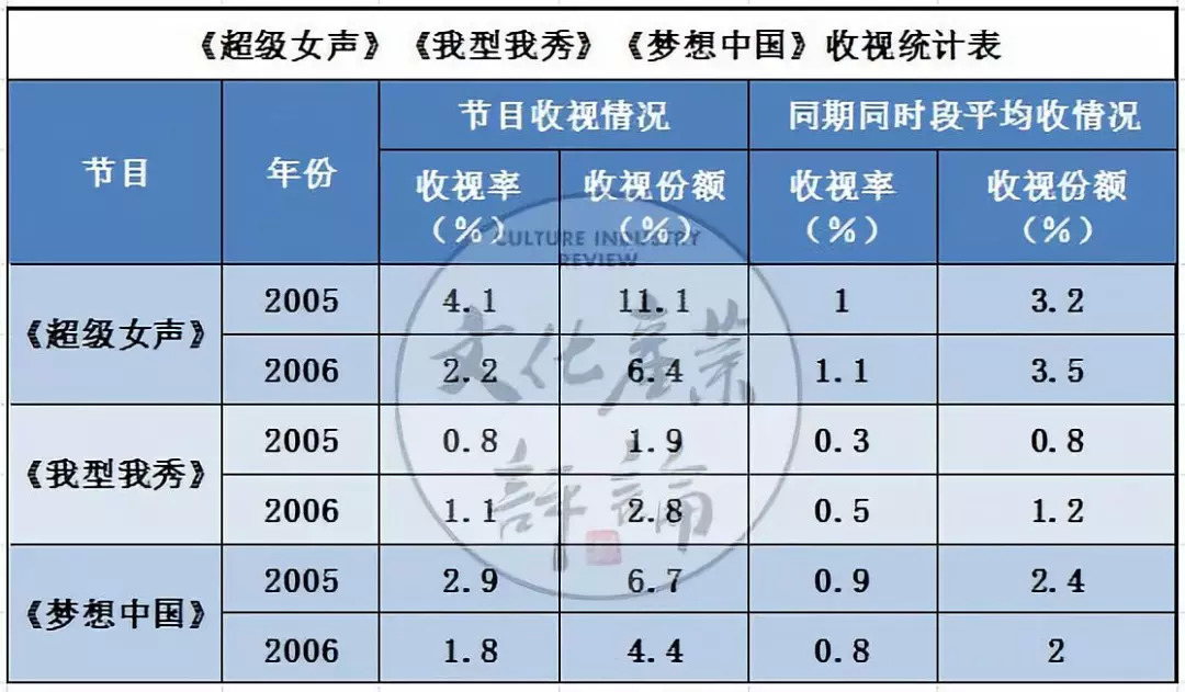 就在一些传统演出类综艺节目风光不再、游戏娱乐类综艺节目造成审美疲劳时,真人秀类综艺节目开始展露头脚。2004年,《超级女声》、《莱卡我型我秀》和《梦想中国》三箭齐发,到了2005年和2006年引起了收视高潮,收视率和收视份额是同期同时段节目平均值的两倍之多。