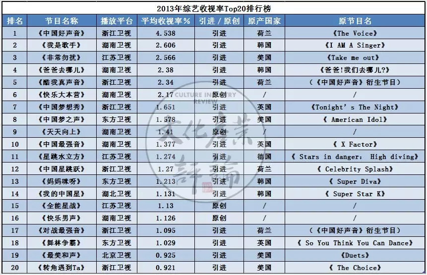 2013年成为“综艺引进”年,形式多样的引进综艺节目纷至沓来,给卫视带来了高收视和高收益。从收视方面来看,2013年综艺收视率Top20排行榜中,仅有《快乐大本营》《天天向上》《全能星战》和《快乐男声》4档为国内原创综艺,其余16档均为引进,占比高达80%(详见下表);从收益方面来看,2013年收视前三的综艺中,加多宝冠名赞助《中国好声音》2亿元,立白冠名赞助《我是歌手》1.5亿元,韩束冠名赞助《非诚勿扰》2亿元。
