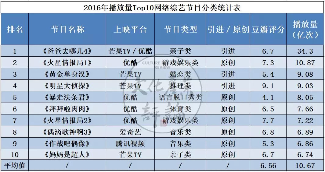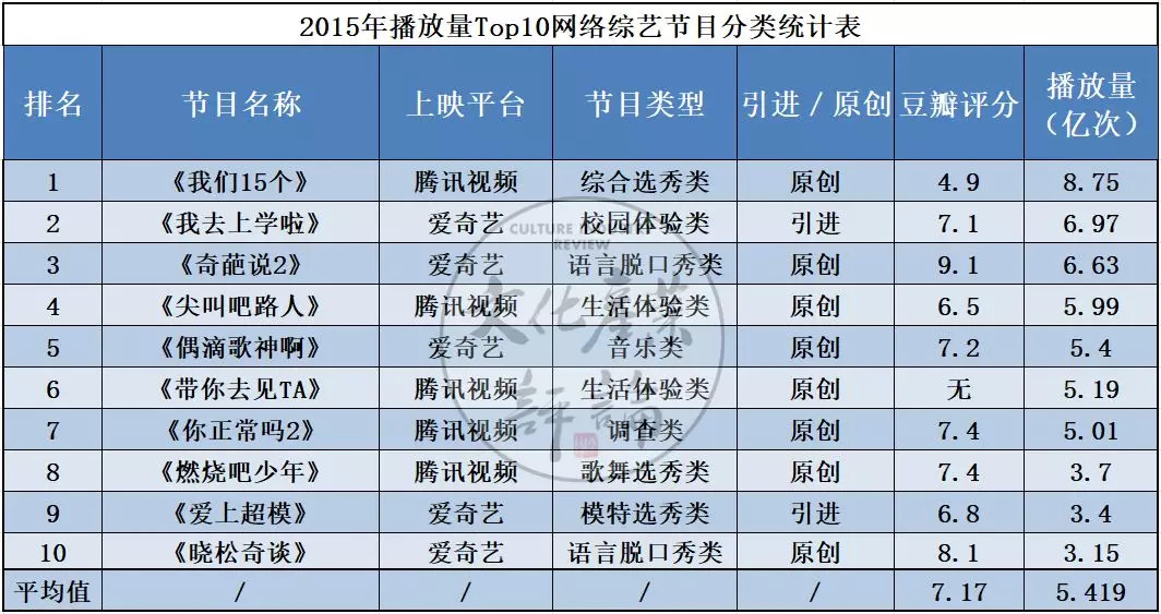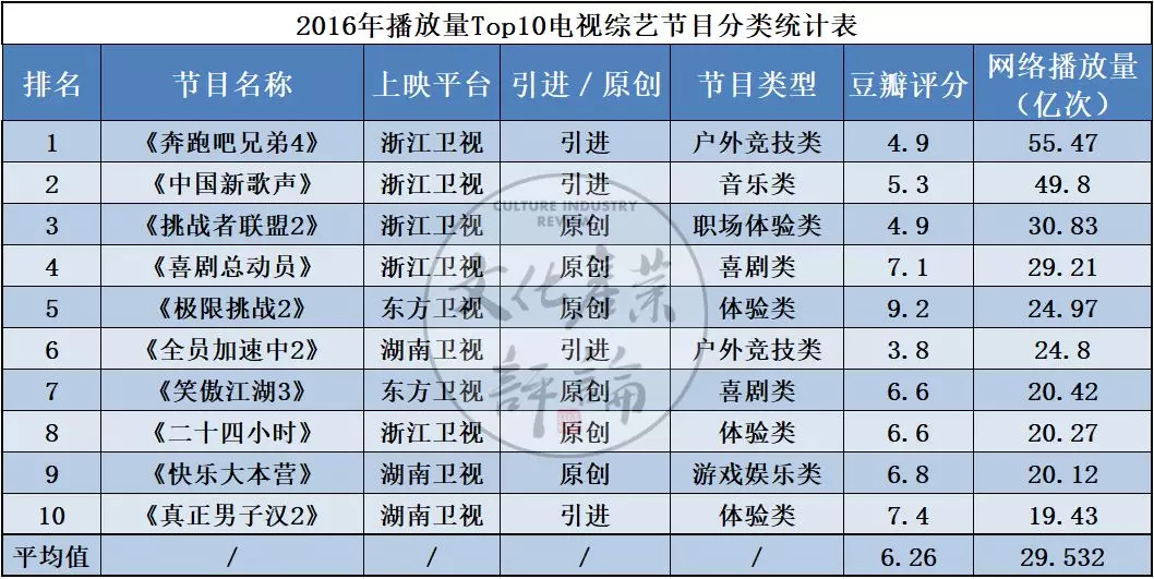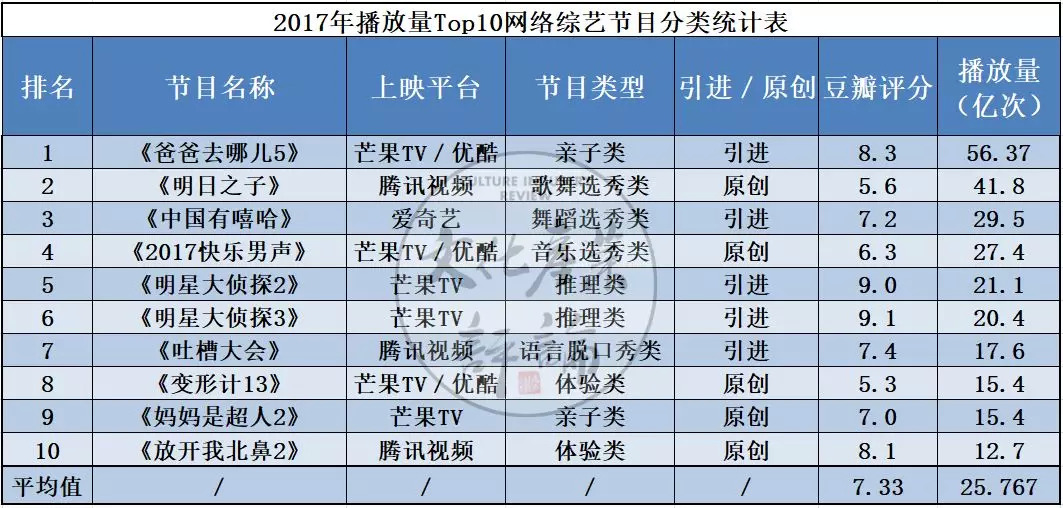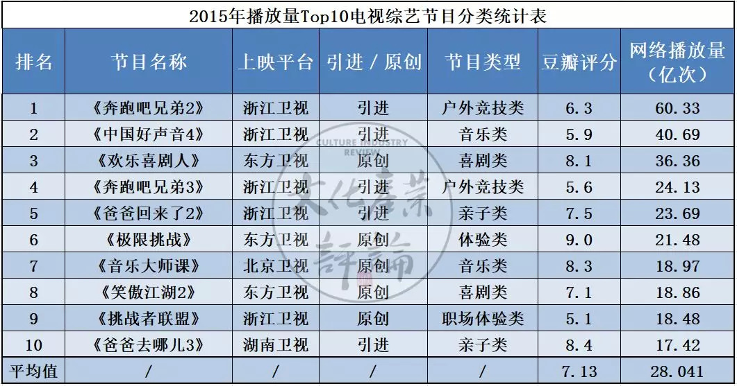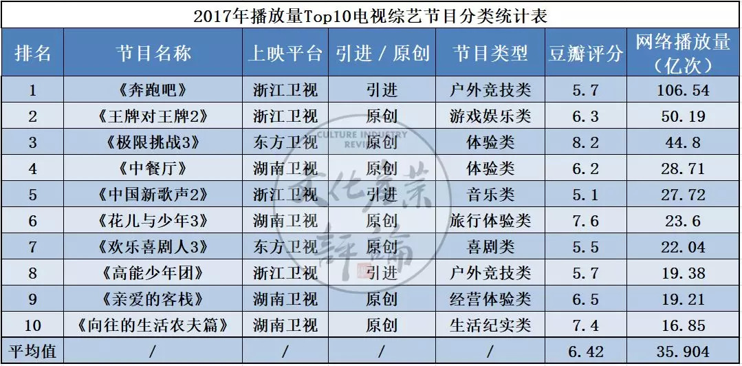 一方面,电视综艺。互联网技术的进步导致了观众观看渠道的多元化,除了收视率之外,网络播放量也越来越成为衡量电视综艺受欢迎程度的重要指标。此处以2015年-2017年收视率和网络播放量Top10为例,分析电视综艺的发展状况。