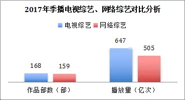 2017年有14档网综破10亿播放,总计贡献了291.2亿次播放量;同年主流视频网站共上线159部网络综艺,总播放量超500亿,市场表现直奔电视综艺。