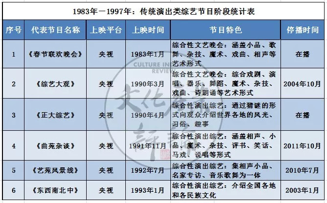 与国外相比,中国内地的综艺节目起步较晚,20世纪80年代才初见端倪,最具代表性的是中央电视台《春节联欢晚会》与《综艺大观》、《曲苑杂谈》等演出类节目。诞生于1983年的《春节联欢晚会》充分利用了晚会演出在社会各界的影响,开创了内地电视综艺节目的先河,为中国电视综艺的发展提供了基本模式和蓝本。它的成功也在中央电视台衍生出一系列类似的节目,创办于1990年的《综艺大观》和《正大综艺》、1991年的《曲苑杂谈》也相继登上荧屏。