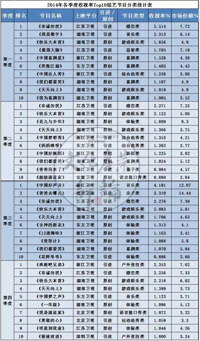 上榜2014年四个季度收视率Top10的综艺节目共计29档,其中引进综艺13档(占比44.82%),原创综艺16档(占比55.18%);节目涵盖了体验类(7档)、喜剧类(4档)、选秀类(4档)、音乐类(3档)、亲子类(2档)、语言脱口秀类(2档)、户外竞技类(2档)游戏娱乐类(2档)、婚恋类(1档)、益智类(1档)、舞蹈类(1档)等多种类型,综艺题材和受众市场的垂直细分趋势明显。