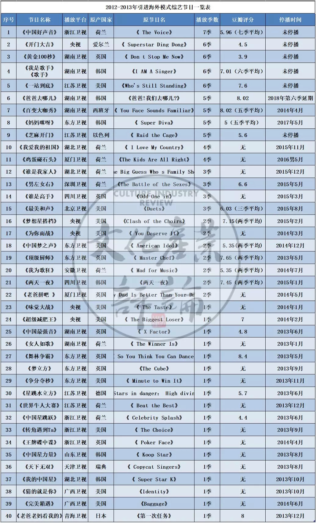 在此背景下,引进类综艺节目在国内呈井喷式发展。据统计,2012年-2013年间,全国引进海外综艺节目达40档(详见下表),各大卫视黄金时段几乎都被这些“舶来”综艺占据。