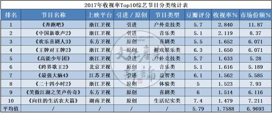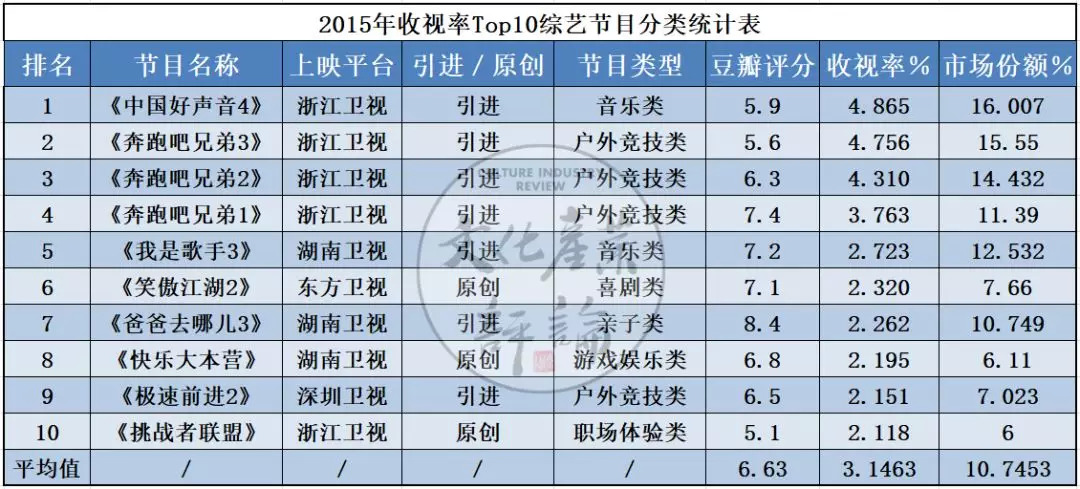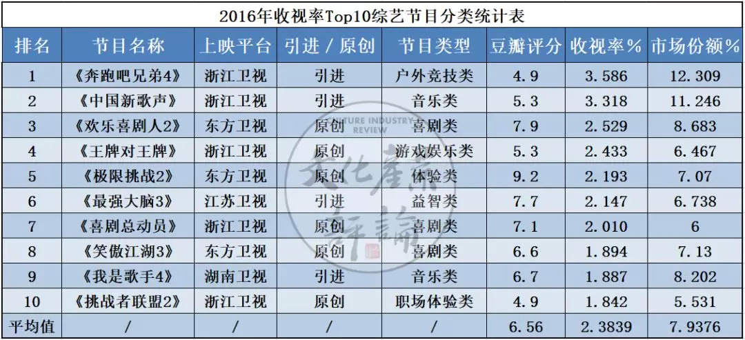 上榜2015年-2017年收视率Top10的电视综艺节目共计16档,其中引进综艺7档(占比43.75%),原创综艺9档(占比56.25%);节目类型包含了音乐类(3档)、户外竞技类(3档)、喜剧类(3档)、游戏娱乐类(2档)、亲子类(1档)、职场类(1档)、体验类(1档)、益智类(1档)和生活纪实类(1档),节目题材日益丰富。