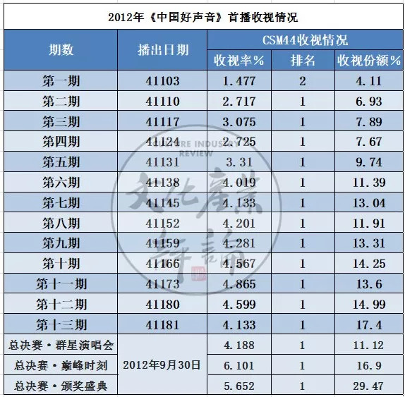 2012年,浙江卫视从荷兰引进的《中国好声音》一骑绝尘,开创了中国综艺“大片”时代。《中国好声音》从节目开播伊始就有1.477%的收视率,随着比赛的持续进行,收视率整体上呈现出节节高升的趋势;到了决赛阶段,收视率突破6%,收视市场份额高达29.47%,稳居全国综艺节目收视率榜首。