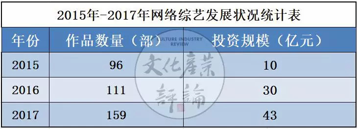 另一方面,网络综艺。2015年-2017年,网络综艺的作品数量和投资规模逐年递增。