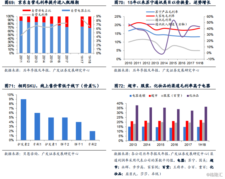 1)京东全品类拓展富有成效,但仍待进一步提升非电产品占比。从渠道商的角度看,超市、服装、化妆品的毛利率一般高于电器,3C(5-10%)→家电(10-20%)→超市(15-20%)→服装(20-25%)→化妆品(30-35%)的基本路径能够逐步提高自营毛利率空间。京东多年来全品类拓展努力下,品类结构逐步优化,但自营中电器品类销售占比近70%,依然对整体毛利率起决定性作用。 2)无论电器3C还是商超快消,线上渠道整体偏价格导向,品类整体毛利率空间或弱于线下。据中怡康数据,17家电线上线下平均销售价差均在30%以上,大家电价差超过千元;根据艺智导购和尼尔森调研数据,17年年京东热销奶粉单价集中于100-300元/kg,同期线下奶粉均价为247元/kg、300元以上高端奶粉占比接近50%, 且电商消费者对促销依赖比实体店更强(62%消费者对促销有依赖,6%非促销不买)。 3)竞争加剧是更为重要的限制京东自营毛利提升因素。阿里战略联盟苏宁加剧线上竞争,尤其家电3C类目成为核心竞争类目。1H18苏宁报表通讯类目毛利率仅为 5.02%(VS12年高点为11.5%),但销售额同比增长36.4%至317.6亿元,以价换量逆势增长;1H18,猫宁电商(苏宁持股51%,阿里持股49%;苏宁易购天猫旗舰店运营实体)半年营收达184.6亿元,亏损6.6亿元;作为对比,猫宁电商17全年营收仅143.3亿元,亏损1.7亿元。