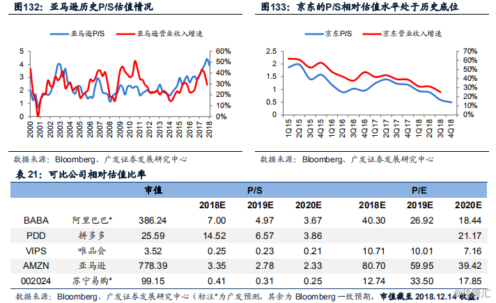 综合分部估值和DCF估值,我们认为京东上市公司合理市值约402亿美元,对应27.75美元/ADS。截至2018.12.14收盘,京东股价为22.17美元/ADS(总市值321亿美元),年初至今下跌46.5%。我们认为今年以来公司市值的持续下跌,反映了二级市场对国内宏观经济和行业竞争格局恶化的过度担忧。京东过往多年依靠体验优势积累的过万亿GMV规模体量使其在供应链端具备较强优势,3亿级品质用户的多品类消费挖掘和平台流量变现依然存在较大空间。给予公司“增持”评级。