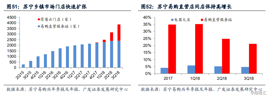 3)低线级区域是更为重要的增量市场。据奥维云网数据,2016年三四级市场 家电(不含3C)消费量达3321亿元;参考GFK测算的家电消费增速(2017年15%,2018年估计6.5%),2018年预计将突破4000亿元,叠加手机消费,三线以下城市整体家电3C市场约9000亿元级别,且低线市场渠道极为分散,线下区域连锁/百货/夫妻店占60%以上,渠道现代化空间大。但考虑低线市场高物流成本和低电商渗透率,线下门店的运营能力一定程度上成为这一市场的核心竞争力。相比京东,多年深耕线下的苏宁更具优势:自2015年底开始乡镇市场渗透以来,截至3Q18期末,苏宁易购主打乡镇市场的易购直营店和零售云加盟店门店数合计已达3861家,且经营情况良好:截至2017年,苏宁易购直营店坪效达到1.84万,接近城市大店水平,1-3Q18可比门店销售同比21.2%高增长。 4)阿里&苏宁结盟带来电器渠道格局变化。依据云观咨询数据,17年天猫平台 电器交易规模1914亿元。天猫(13.9%)+苏宁(16%)合计在全渠道电器市场份额达到29.6%,超越京东(26.4%)。阿里+苏宁组合兼具规模、流量和全渠道运营优势,且乐于通过价格竞争快速扩大规模(我们随机抽取13款热销家电3C产品,其中7款苏宁&天猫价格更低,2款京东更低)。反映到财务数据,17年京东自营电器类增速放缓至35%,同期天猫平台电器类增速49.8%;2015年以来苏宁线上渠道增速始终快于京东,而3Q17以来,苏宁更是全渠道整体GMV增速也持续领先京东。3Q18, 苏宁全渠道/线上GMV增速61.7%/37%,京东仅为30.5%。