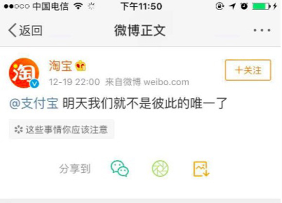 12月19日晚,淘宝在官方微博上突然@支付宝,说“明天我们就不是彼此的唯一了”,仿佛要有大事发生。这引得微博用户纷纷猜测,难道淘宝要接入银联了?