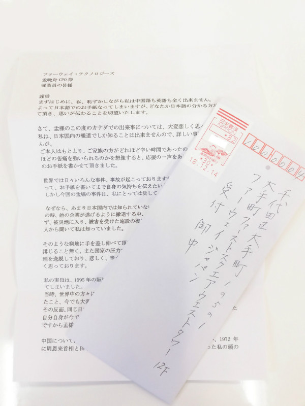 12月19日,华为“心声社区”公布了一封来自一位日本市民的声援信。