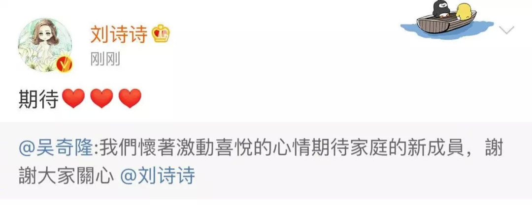 吴奇隆也在微博发文宣布妻子刘诗诗怀孕的喜讯:“我们怀着激动喜悦的心情期待家庭的新成员,谢谢大家关心。”刘诗诗也转发该微博称:“期待”。