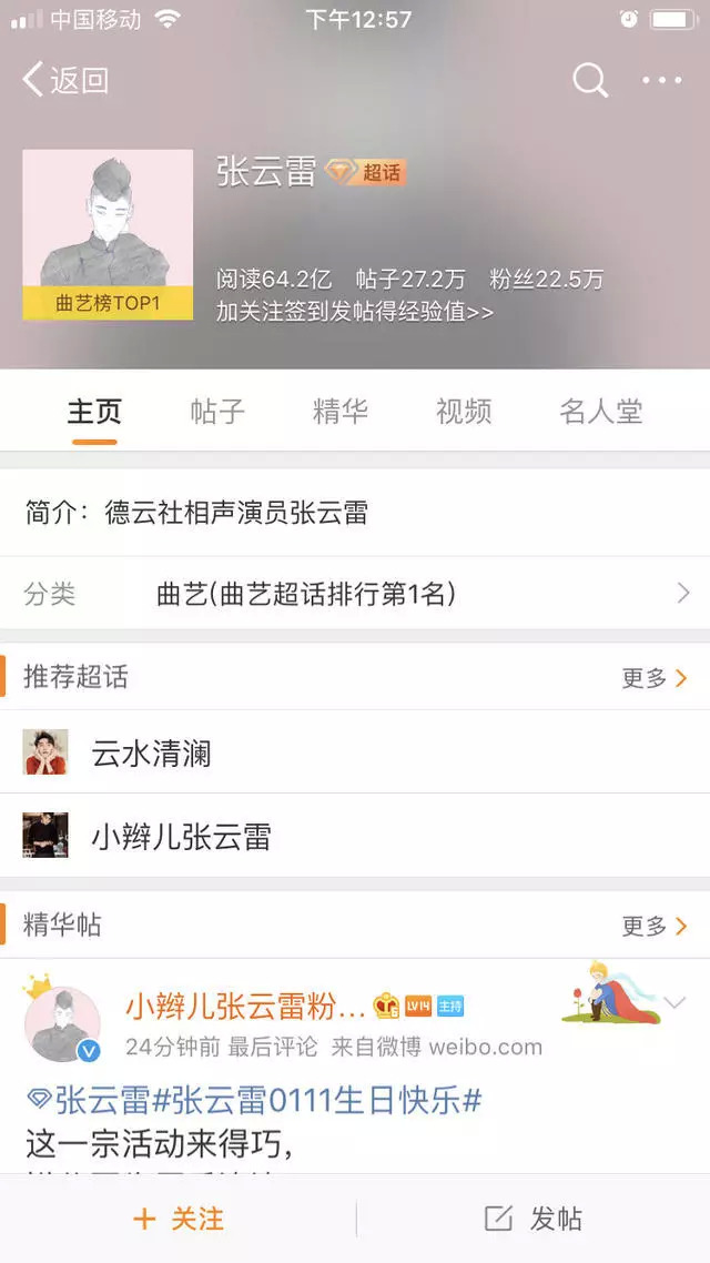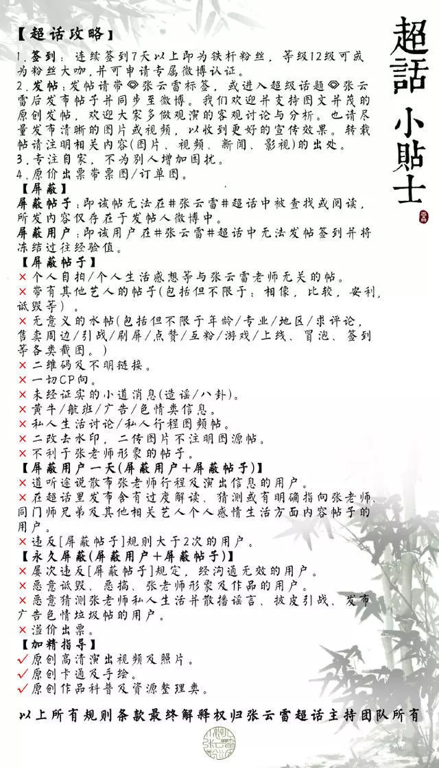 微博超话有签到的功能,签到的次数越多,在超话中等级越高。粉丝人数越多、粉丝发微博的数量越多、粉丝活跃度越多,明星在超级话题上的排名就越靠前。因而,不少明星的官方或非官方粉丝团都有硬性规定:想加入粉丝团,必须每天要在超话里发XX条微博。或者,超级话题的活跃度超过XX,才有资格申请加入粉丝团;而加入了粉丝团,能独享某些优待。比如,张云雷的粉丝团成员可以团购演出票,价格虽然不可能便宜,不过座位都相当不错(能看到张云雷的正脸)。