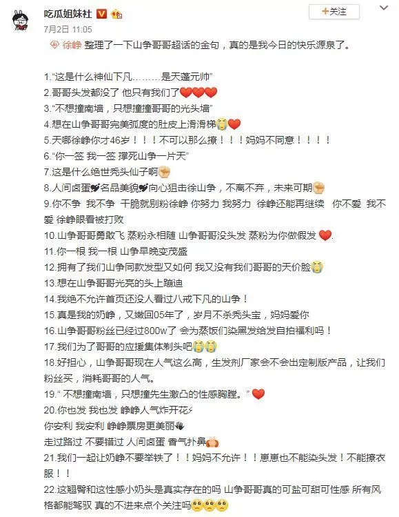 饭圈女孩喜欢吹自家偶像的颜值,山争哥哥的颜就是“什么神仙下凡……是天蓬元帅”;饭圈女孩喜欢突出自己对偶像的重要性,于是乎,“哥哥头发都没了,他只有我们了”;饭圈女孩喜欢称自己的偶像是“人间仙子”,山争哥哥就成了“人间卤蛋”。
