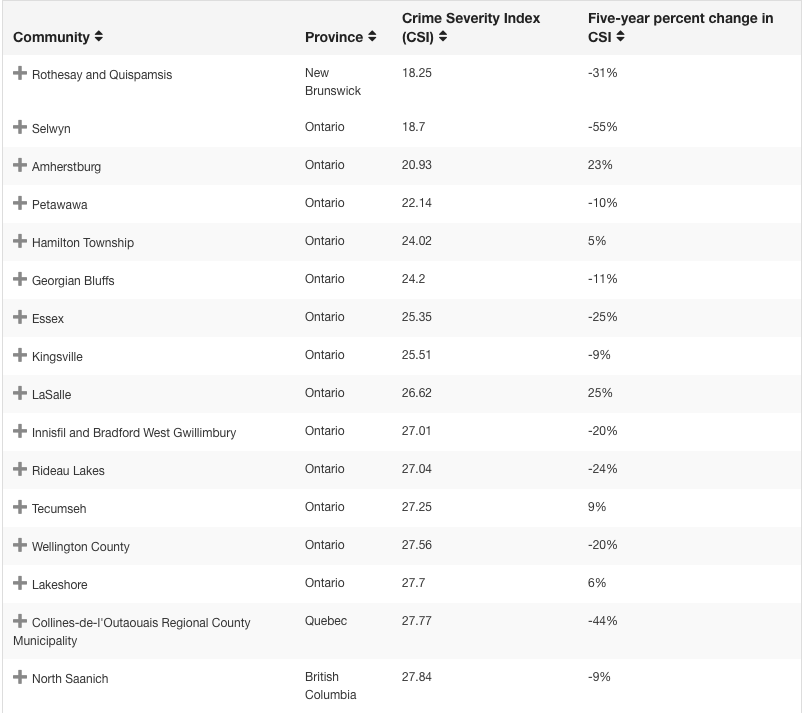 事实上,无论你住在加拿大哪一地区,成为犯罪受害者的可能性都很低。但,如果你想待在犯罪率最低的地方,新不伦克省的Rothesay和Quispamsis可能和合适。这两个位于圣约翰东北部的两个河边城镇,人口29000,犯罪严重程度指数为18.25,是237个加拿大城市地区中最低的一处,比整体CSI值72.9低近55个点。(CSI值,又称犯罪严重程度指数,是加拿大统计局用来衡量犯罪数量和严重程度的一项指标)