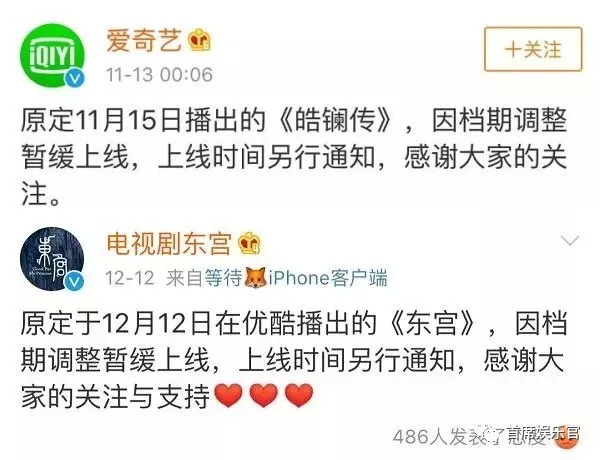 改编自匪我思存同名小说的《东宫》也是如出一辙的遭遇,原定于12月12日在优酷上线,却在播出当天宣布同样内容:因档期调整暂缓上线,上线时间另行通知。