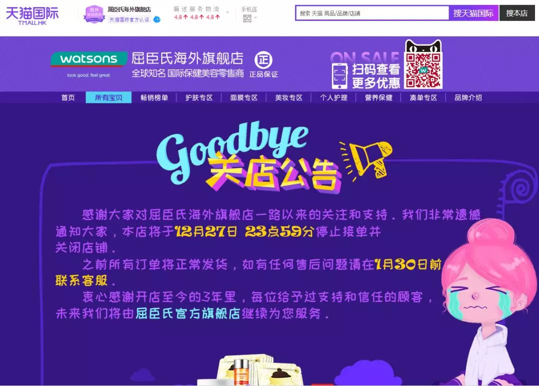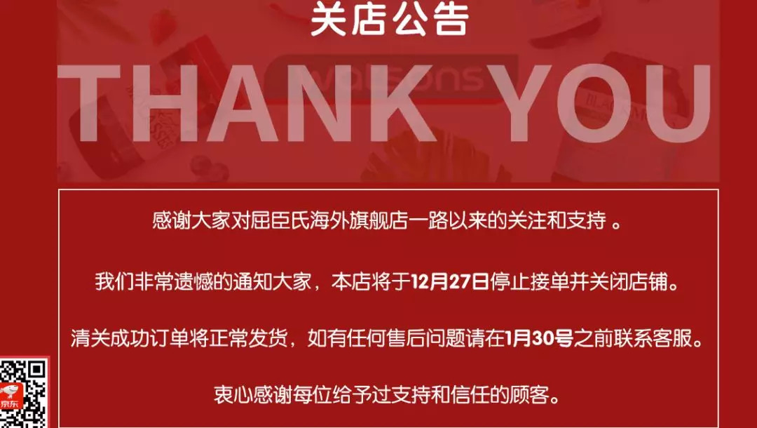 据悉,屈臣氏在天猫国际和京东平台的海外旗舰店均已发布关店公告,将于本月27日停止接单并关闭店铺,已售商品的任何售后问题也需在1月30日之前联系客服处理。同时,屈臣氏天猫国际海外旗舰店在公告中表示,海量进口商品已经进驻屈臣氏官方旗舰店,并在公告中设置了跳转接口。