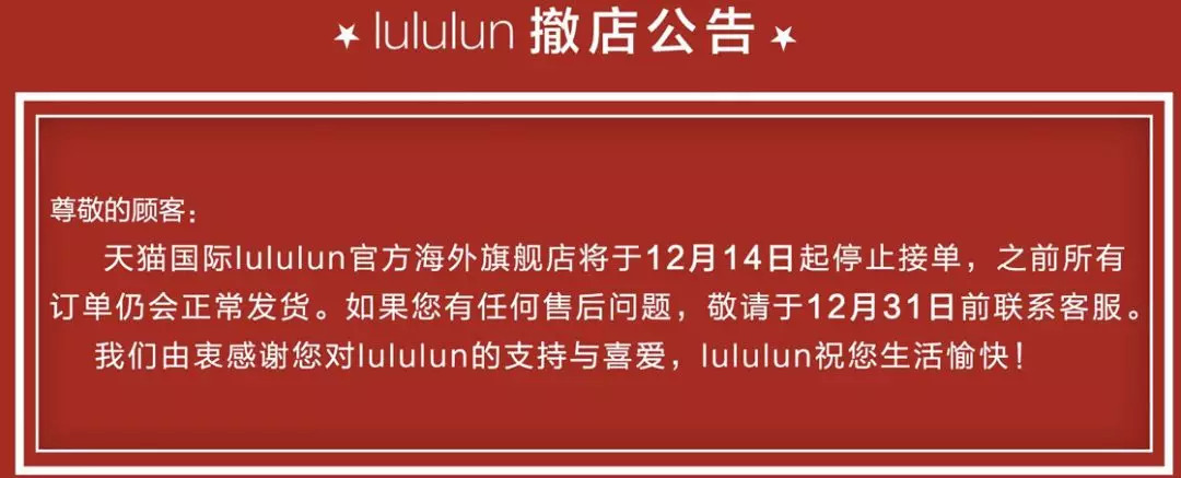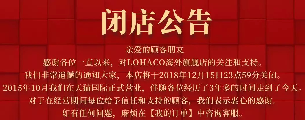 无独有偶,2017年8月入驻天猫国际的日本面膜品牌lululun海外旗舰店,以及2015年10月开业的日本大型购物平台LOHACO海外旗舰店均已在本月发布撤店公告。