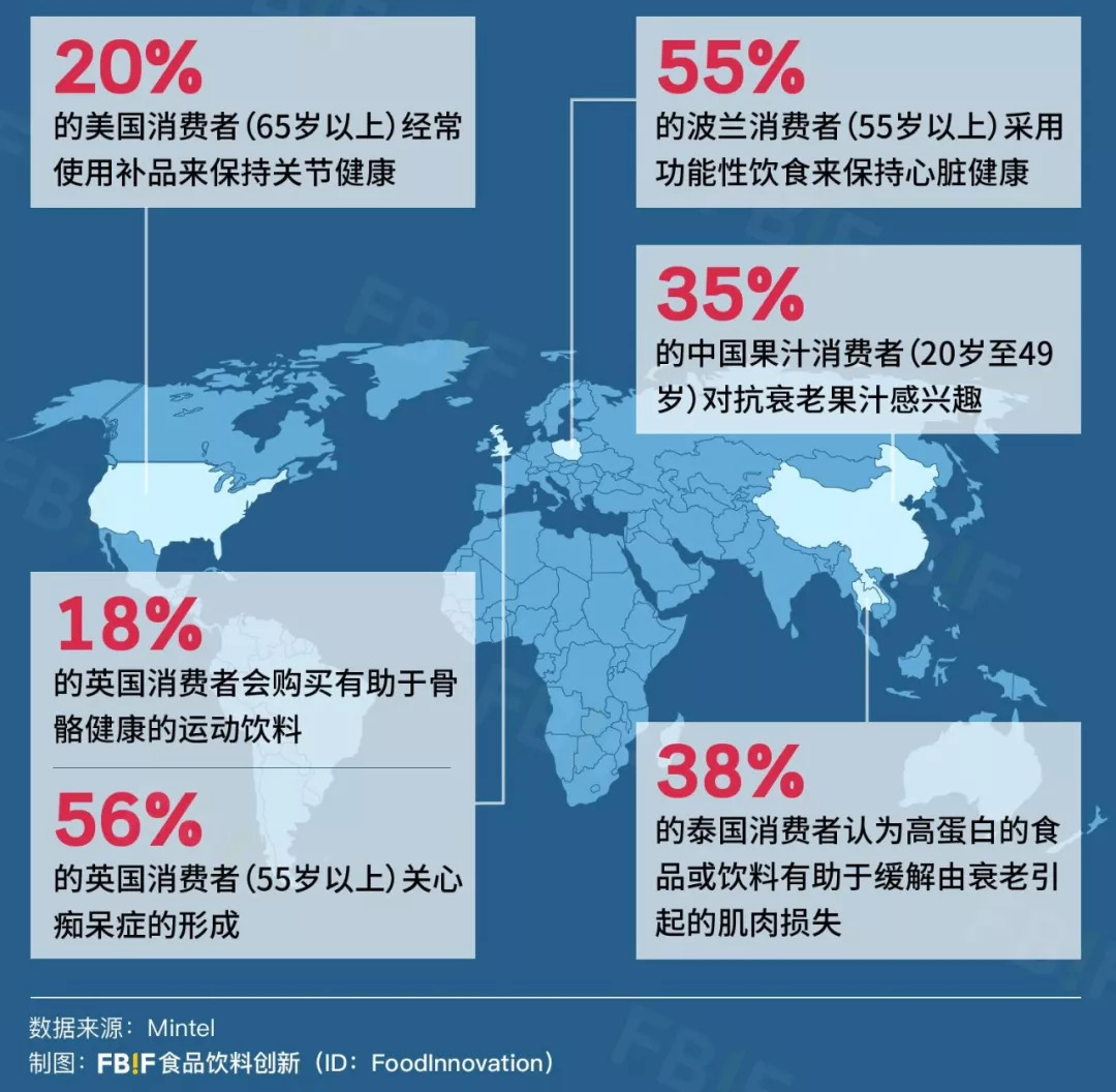 Mintel发布的报告中指出,消费者正在寻找能够延缓衰老的产品,尤其是那些标榜为健康老龄化的产品,他们希望能够通过饮食来保持身体年轻的活力。