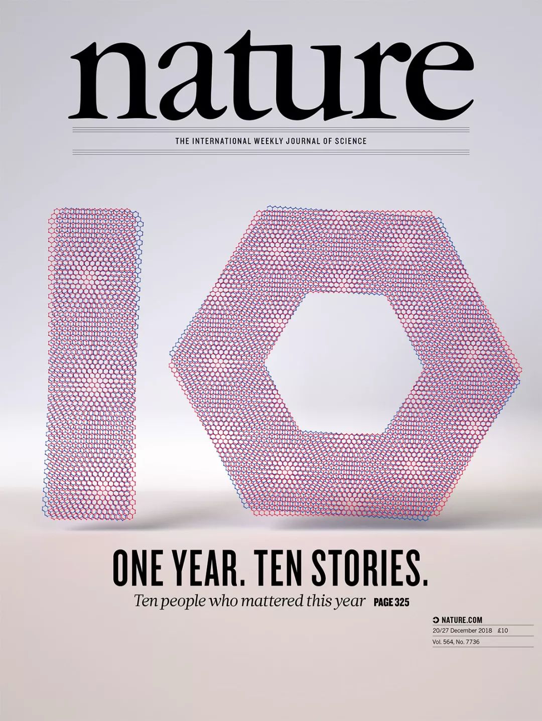 今年的封面图片明显指向曹原的发现,数字“10”中的“0”被处理成一个正六边形,宛如构成石墨烯的碳环结构。仔细看可以发现,数字“10”都是由二层蜂窝状的小正六边形填涂而成,分别为红色和蓝色,两层之间有微小的夹角,使得图像出现了重影。这点出了赋予石墨烯超导能力的“魔角”。