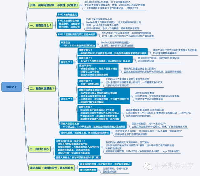 对于雾霾这样一个复杂庞大的问题,只用了不到2个小时的时间却让各种观众都能看的懂,包括政府官员、相关企业、专业人士、不懂雾霾科学的普通大众,交代每个问题之间的转场设计圆润而严丝合缝。因此这对我们长期以来产生的一种误区也带来了思考,那就是给客户的报告页数越多越好,PPT越厚,对客户花的钱越负责。这往往也与客户方的思维习惯有关,也曾有遇到过有客户要求在10页片子内把问题说清楚,且每页片子上只能布局不超过三分之二的内容。咨询顾问一般都言辞丰富、能言善辩,我们往往不缺乏表达,我们需要提高的是精确表达,甚至精致表达的能力。