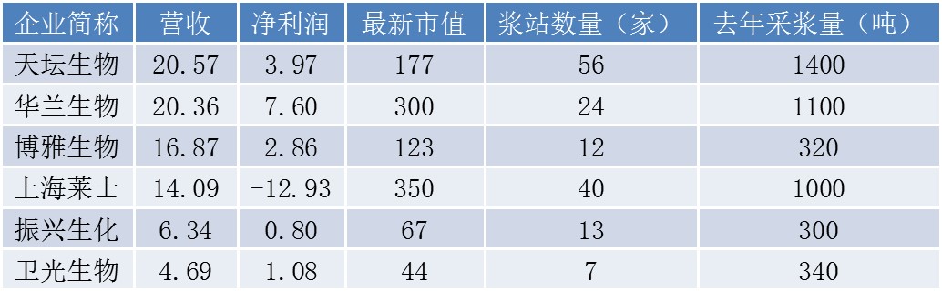 目前,除了上海莱士之外还有5家血液制品上市公司,包括天坛生物(600161.SH)、华兰生物(002007.SZ)、博雅生物(300294.SZ)、振兴生化(000403.SZ)、卫光生物(002880.SZ),其中天坛生物无论是在浆站数量还是采浆规模均位居第一,去年采浆规模1400吨;上海莱士还位于华兰生物之后,去年采浆量约1000吨,但浆站数量获得一定优势,未来将持续面临行业内部的竞争挤压。