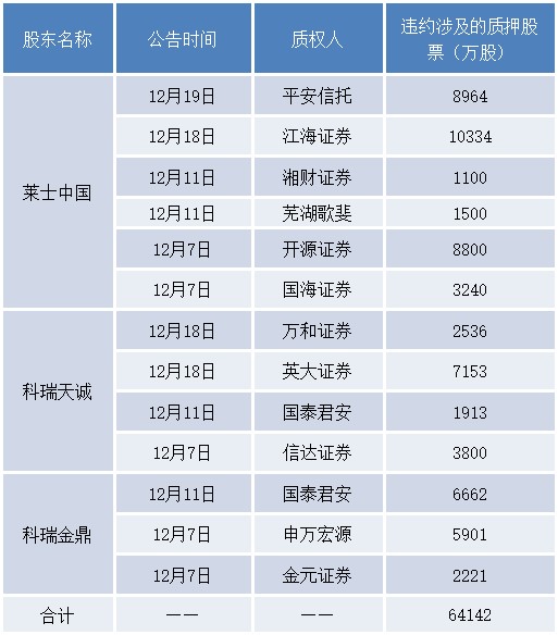 12月18日和19日晚,上海莱士先后称,莱士中国质押给江海证券的10,334万股股份和平安信托的8964万股股份构成违约;科瑞天诚质押给万和证券的2536万股股票和英大证券的7153万股股票也因逾期构成违约,面临被动减持风险。