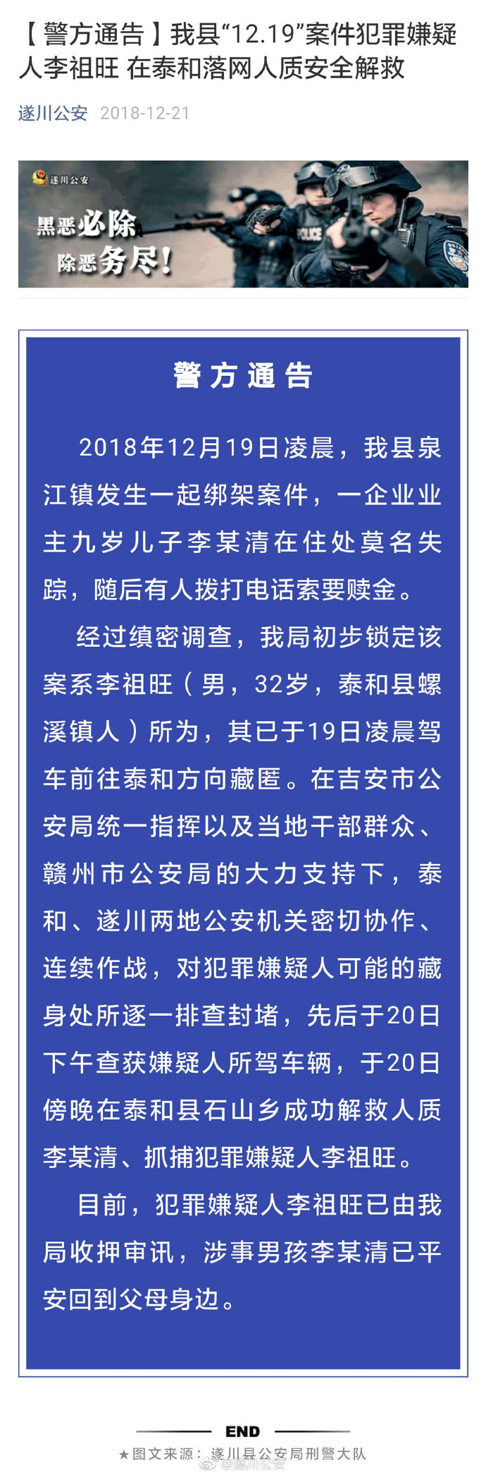 江西省吉安市遂川县公安局通报,2018年12月19日凌晨,我县泉江镇发生一起绑架案件,一企业业主九岁儿子李某清在住处莫名失踪,随后有人拨打电话索要赎金。