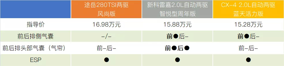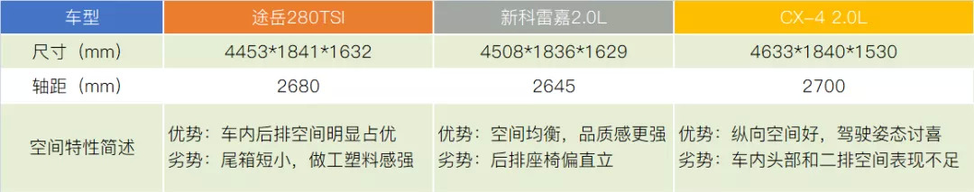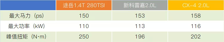 在动力和底盘操控方面三款车都是前麦弗逊后多连杆独立悬架,底盘出身也都非常不错,行驶质感都能有保障,途岳和新科雷嘉还是更偏重于居家需求,而CX-4更为注重驾驶乐趣,悬架支撑的调教偏硬朗。值得一提的是,笔者在场地试驾CX-4时发现重心依然较高,在测试科目过弯表现和轿车差异依然很大,姿态更偏重于高重心的SUV车型,这有助于通过性,但不能满足一些人在操控方面想实现的臆想中的“SUV与轿车运动性的结合”。