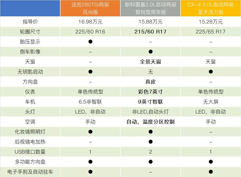 对于预算更充足的消费者而言,比15.88万元更高配的车型会搭载仿皮座椅、LED大灯、胎压显示、18寸轮圈、定速巡航等等,在格调和舒适性上会更好一些。考虑到目前市场上新科雷嘉有较好的终端优惠,部分高配车型其实也处在15万的价格区间上,所以15万的预算选购新科雷嘉会比选购途岳和CX-4更从容,买到的配置也更高。