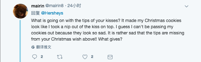 有人买了6包巧克力,糖果“尖部(tips)”都断裂了;有人抱怨好时巧克力毁掉了他们假日季手作的曲奇饼干,因为Kisses巧克力“尖部”是饼干重要的装饰部分;也有关于好时巧克力价格上涨、个头越来越小的讨论。
