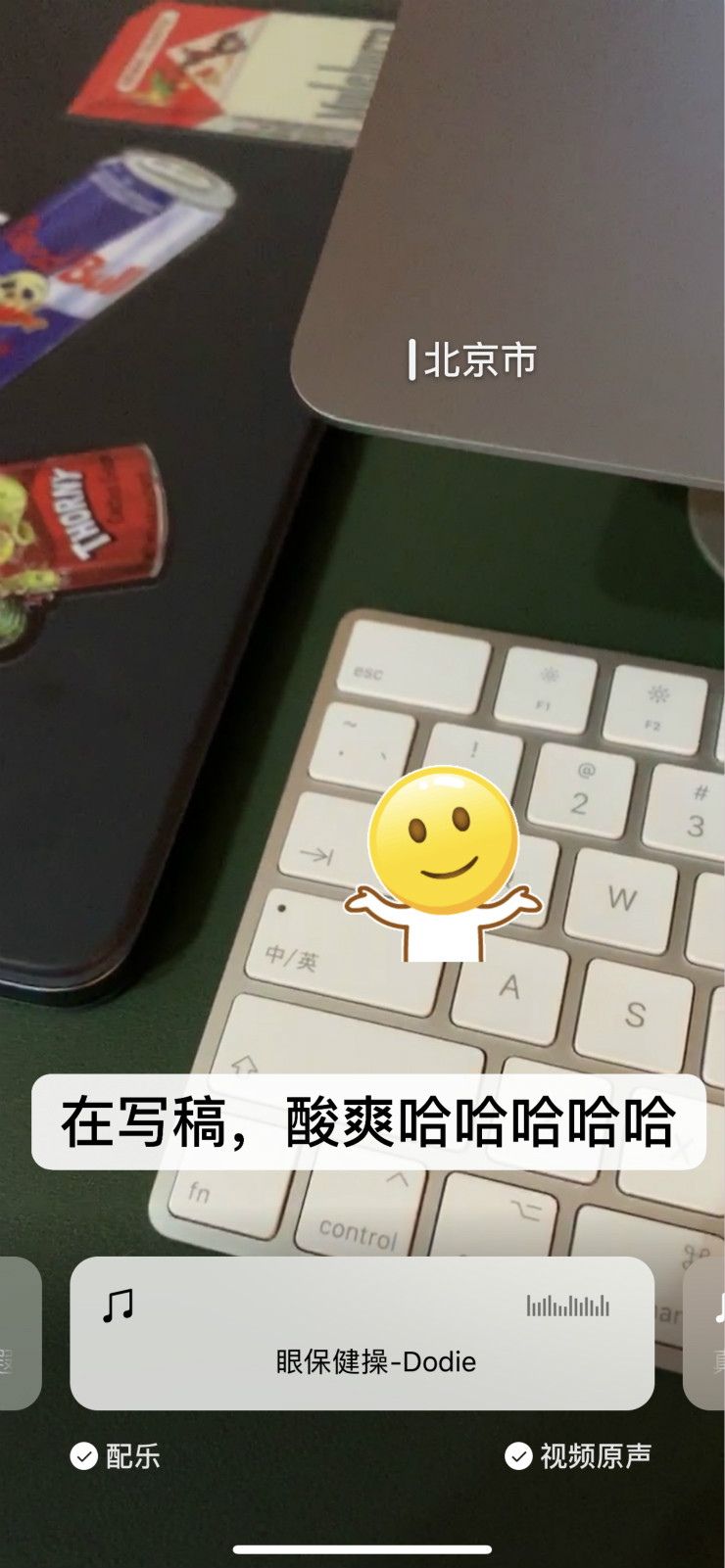 让我没想到的是,当我录制写稿的视频后,配乐的推荐中提供了多种选择,其中之一是图中的眼保健操,另一个则是死机配乐。根据身边人反馈,『时刻视频』在视频配乐方面加入了智能识别,例如我的朋友发布了一个在雪地劈柴的视频,配乐给他推荐的就是一首围绕下雪、孤独、爱情这三个关键词有关的歌曲。