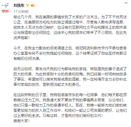 刘强东发表声明道歉,称将更努力投入到工作当中