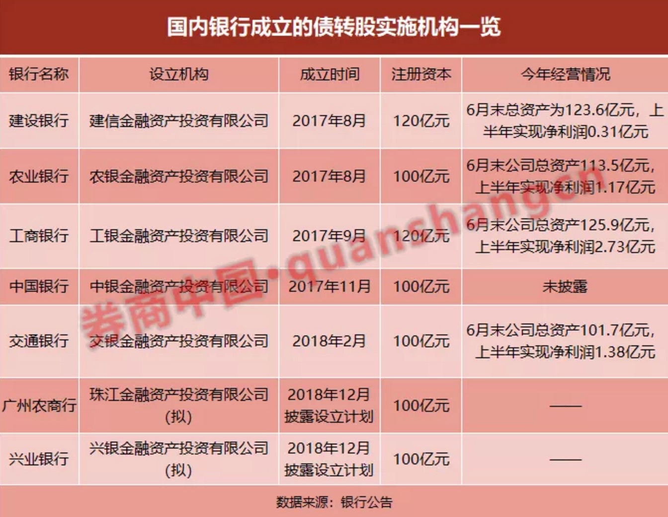 在这之前,五家国有大行发起设立的债转股实施机构自2017年三季度起陆续开业,注册资本在100亿元至120亿元区间。这也是银监会批准成立的国内首批银行系市场化债转股实施机构,具有非银行金融机构特许经营牌照。