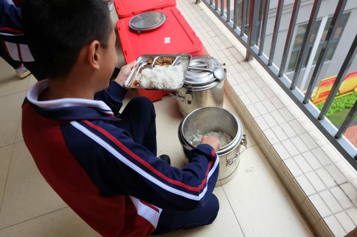 肇庆一中实验学校校内课后服务的费用参照端州区出台的文件标准,学生每天在校吃午餐10元,午休6元,课后托管6元。为保证学生吃得饱,学校要求餐饮企业配多一些米饭,记者发现不少初一男生吃完后都会主动去添饭。
