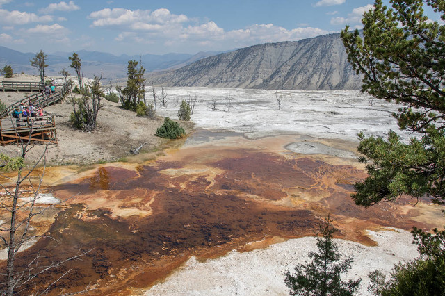位于美国黄石公园猛犸温泉是世界上已探明的最大的碳酸盐沉积温泉,它最显著的特点当属米涅瓦阶地,那是几千年来冷却沉淀的温泉水所形成的一连串阶地,形成阶地一大要素就是碳酸钙。远远望去这里堆金积玉、晶莹剔透,留下的热泉沿着山坡形成一个一个非常漂亮的五彩大台阶,同样的景色让人不由想到中国四川黄龙的五彩池,不一样的是,黄龙是冷泉,而猛犸是热泉。
