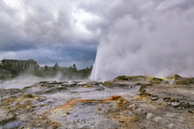 新西兰北岛中北部的罗托鲁阿市坐落在火山多发区,全市遍布热泉,空气中硫磺弥漫,热泉灰黄泥浆沸腾,加之毛利文化多姿多彩,前来观光的游客终年络绎不绝。这里到处可见冒着蒸汽的温泉、硫磺湖和沸腾的泥浆地,不时有蒸汽从地洞中喷出,仿佛有一头活着的巨兽还潜伏于地底,无怪乎被称为“地狱之门”。