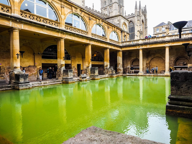 英格兰西南部巴斯城,被誉为英国最干净的城市。巴斯的英文意为浴池,罗马浴场在巴斯城中心,它是巴斯最著名的景点,也是为众人所熟知的博物馆。是联合国文化遗产保护单位,地下有温泉,罗马时代在此建浴场。浴场由一系列建筑组成,有更衣间、休息间和浴场。这个温泉从3000米深的地下,每天喷出127万立升泉水,温度常年保持在46.5度,既可饮用,又可治病。在热气腾腾的古老浴池旁,还保存有国王当年洗浴的“宝座”和他的塑像。