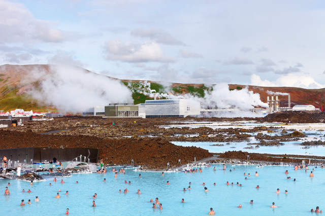 冰岛西南部,距离首都雷克雅未克大约39公里的蓝湖地热温泉,是冰岛最大的旅游景点之一。蓝湖洗浴和游泳的礁湖地区水温平均在40℃左右,水体有丰富矿物质,如硅和硫,在蓝湖泡温泉可以帮助治疗皮肤疾病。即使在雪花飘飞的冬季,湖面依旧热气弥漫,如烟似雾,融入其中,感觉仿佛沉浸在迷蒙世界里。如果水性好,还可潜水去挖白色的温泉泥涂在脸及身体上,据说能美颜健体喔。