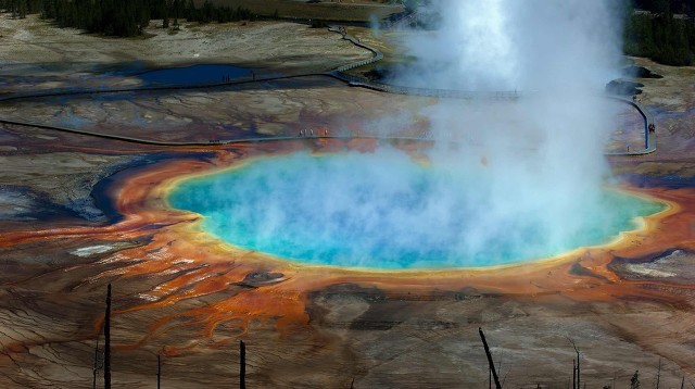 位于黄石国家公园的大棱镜温泉是美国最大、世界第三大的温泉。它宽约75至91米,49米深,每分钟大约会涌出2000公升,温度为71°C左右的地下水。大棱镜温泉的美在于湖面的颜色随季节而改变,春季,湖面从绿色变为灿烂的橙红色,这是由于富含矿物质的水体中生活着的藻类和含色素的细菌等微生物,它们体内的叶绿素和类胡萝卜素的比例会随季节变换而改变,于是水体也就呈现出不同的色彩。