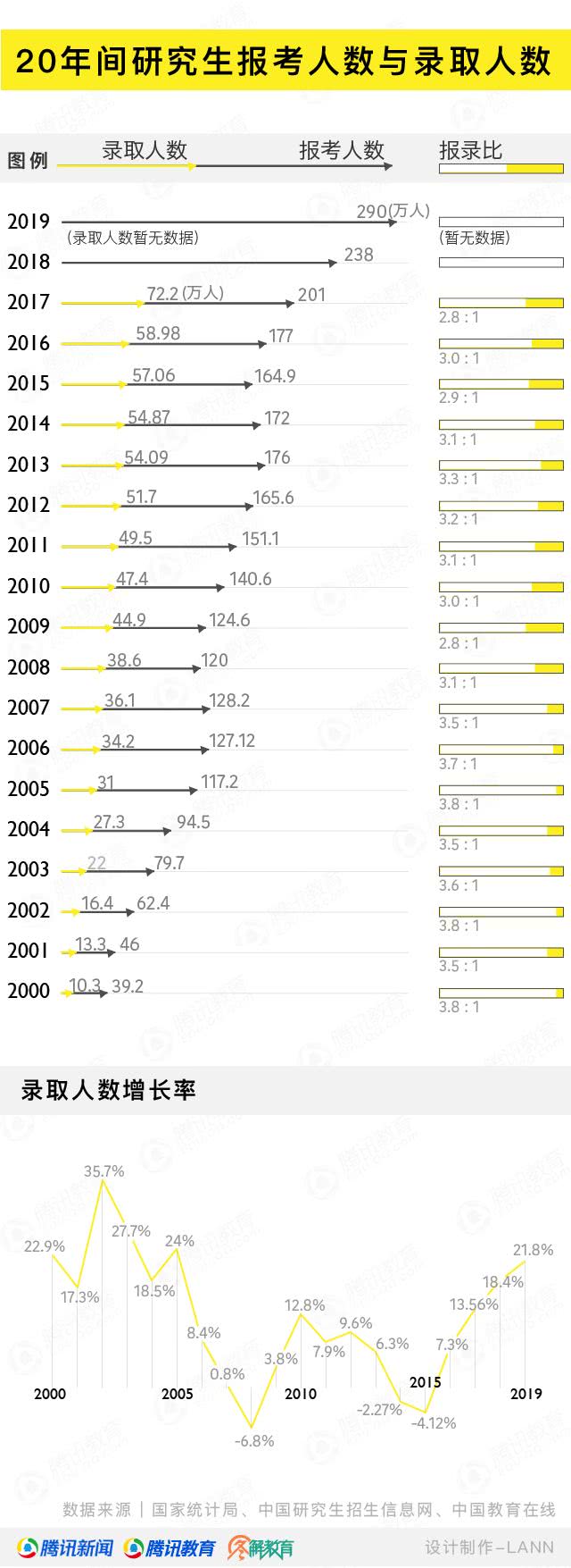 近几年,考研越来越热,这反映在报考人数的逐年攀升上。从2000年的39.2万到2019年的290万,报考人数20年间翻了9倍。与之一起增长的,是高校的硕士研究生录取人数。从1999年大学扩招以来,高校的招生数也持续增长,和20年前对比,这一数据也增长了超过7倍。