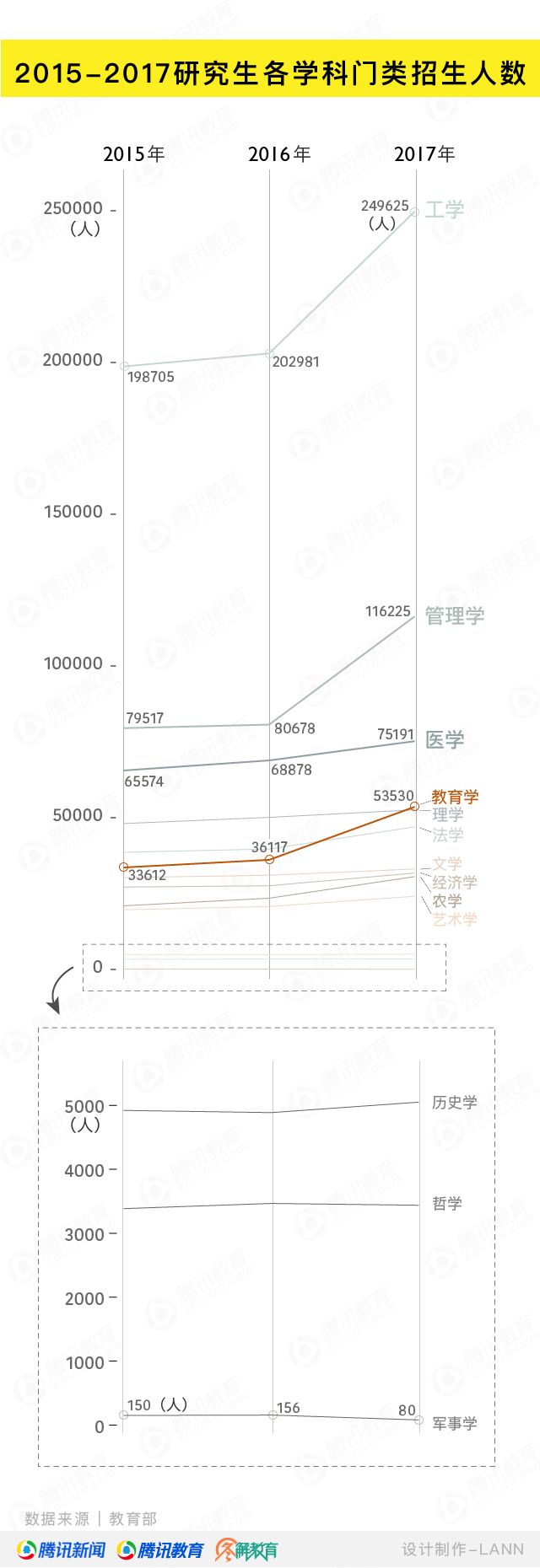 根据教育部发布的年度教育统计数据,2015年至2017年,硕士研究生招生最多的学科门类均为工学、管理学和医学。除军事学外,其他学科门类的硕士研究生招生数均有上涨,教育学招生数增速最快,三年间增长了近60%,这也让它在2017年超过法学和理学学科,成为招生人数排名第四的学科门类。