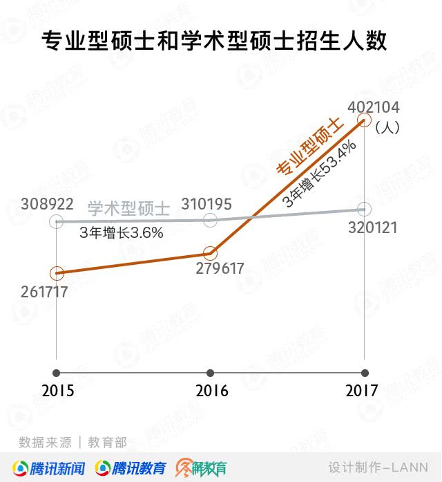 而在招生方面,2017年,专业型硕士的招生数也超过了学术型硕士,与3年前相比,增幅达到53.4%。