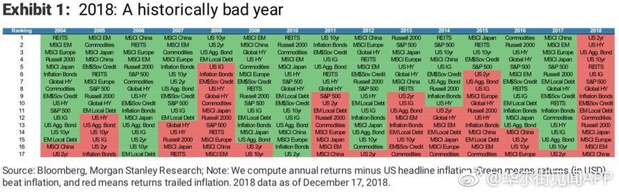 无独有偶,本周初摩根士丹利也在报告中指出2018年是史上最差年份,称除了现金以外,所有资产类别都在下跌,还说:“如果有人希望搞清楚为何今年投资多种资产这么艰难,不用找什么原因了,今年就根本无处可躲。”