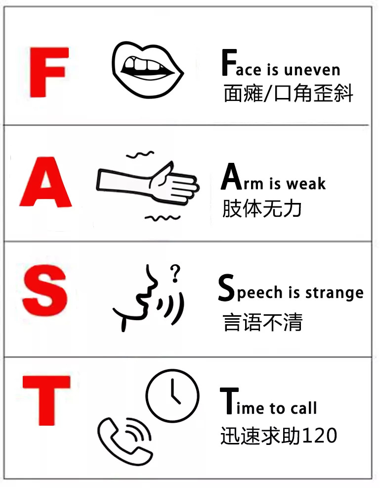 中风的发生通常很突然,国际上提倡运用FAST原则快速识别中风: